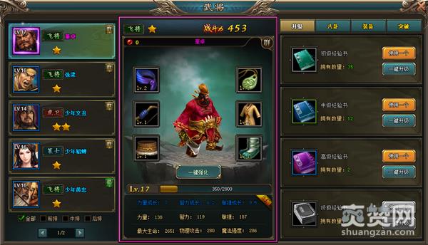 通常,玩家可通过升级、八卦、装备以及突破等四个方式来培养武将。升级是最基本的培养方式。当玩家获得足够的经验书时,可对任意武将进行升级,提升被升级武将一定幅度的战力。经验书的等级越高,武将升级的速度就越快。