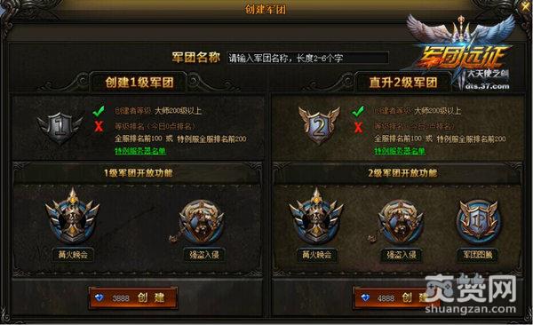 37《大天使之剑》此次新上线的跨服军团系统目前已开放了军团等级权限、军团贡献、图腾、领地以及军团日常活动等多项功能,不久还将迎来令人热血沸腾的军团战。当服务器开服时间≥30天将会开放军团系统,玩家可通过军团界面创建军团,创建军团时可选择创建1级军团或直升2级军团。