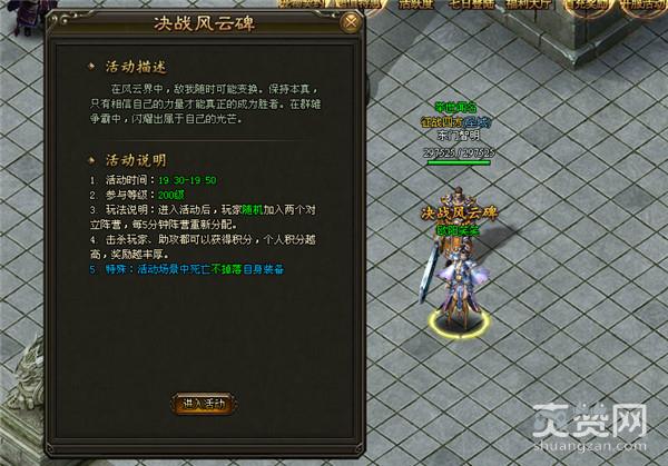 决战风云碑,感受全新阵营战!这里是360uu《灭神》位大家带来的乱斗战场,一场群雄争霸的角逐,两大阵营间的强强对抗,每晚七点半准时开战,玩家们将随机加入两个对立阵营中的一方展开对战,在这个所有人都是战士的传奇版本里,杀出一条属于自己的血路!击杀、助攻玩家以及击杀场内怪物都可以获取积分,而积分的多少则将决定最后的奖赏,感受这个夏季单职业传奇战场中的真正乱斗,一起激情从这里延续!