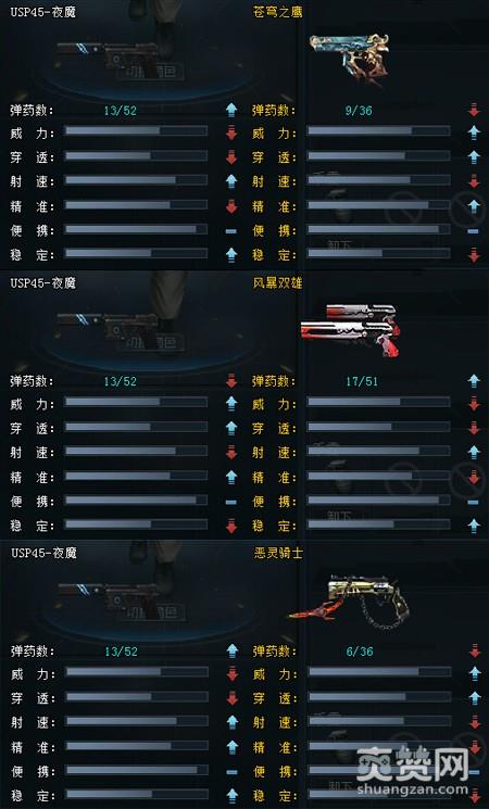 最后来看看“USP45-夜魔”与其他同类型武器的属性对比吧。属性对比仅供参考,实战中的身法和枪法等才是关键哦!