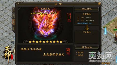 同天书和印记相似,符文也分为十二阶,每一阶有10星,消耗符文碎片可升星级,升至10星后可进阶获得生命、攻击属性,看起来比天书和印记系统内容更丰富、更厉害,其附加的对BOSS伤害加成属性也是一大亮点,随着符文品阶的提升,对BOSS的伤害加成也会逐渐增加,在面对BOSS之时你也会毫不畏惧,毕竟有额外属性加身,BOSS也难逃你的法掌啦!