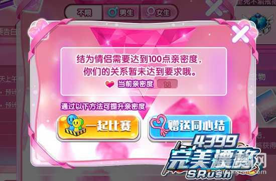 需要亲密度达到100才可以追求对方哦。亲密度可以通过以下和好友一起比赛或者购买同心结获得。