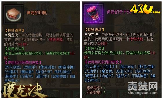 在现实中,麻椒、花椒、辣椒属于调味料,一般人根本下不了口啊,但是在43u《魔龙诀》中,照吃不误哦!麻椒、花椒、辣椒可以让玩家换位体验道士、战士、法师的威力,不过因为是重口味佐料,所以玩家只有20分钟的体验时间哦!话说这三种佐料很容易得到,所以吃完还有呢!