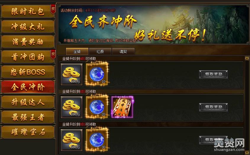 活动期间坐骑、红颜、魂契达到对应的等阶,即可领取相应奖励。