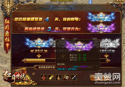 当然,我们有了区别于人的称号外观怎么够,物质奖励也一个都不能少!每天上线都可以领相应的爵位礼包,金条,攻击药水,副本卷轴等等应有尽有。而且爵位越高工资越多,四舍五入等于免费领了一个亿呀~!这样的《红月传说》你怎么能够拒绝呢?