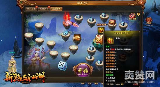 在腾讯《新热血江湖》的副本大厅中,玩家可以看到江湖奇遇的游戏界面,江湖奇遇中有一张平面的游戏地图,其上由24格石阶围绕而成,玩家通过投掷骰子在石阶上方移动。