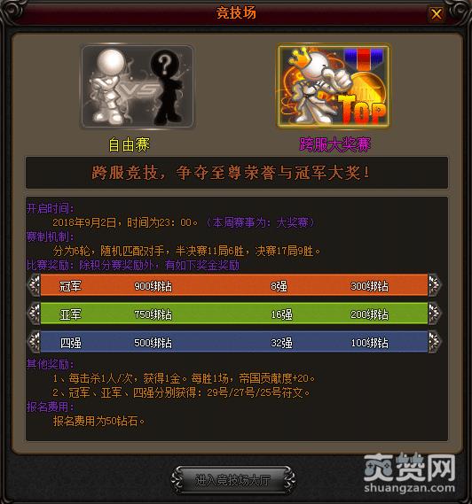 大奖赛需要比赛当天提前报名,最多可以同时报名64人,每场比赛开始都将淘汰一半,直到产生冠军。从32强开始,胜利即可获得大量绑钻奖励,冠军、亚军、季军还可以获得高级神符。并且,在每场战斗中,还可以获得帝国贡献和金钱奖励。