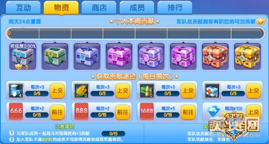 俗话说,兵马未动,粮草先行。一个军队怎么能没有丰富的物资储备呢。上交的物资越多,个人贡献就越多,贡献达到一定值之后就可开启下面的宝箱领取军令。如果物资不足,还可以在军队互动界面发起物资请求。有职位的成员可获得额外贡献加成哦。
