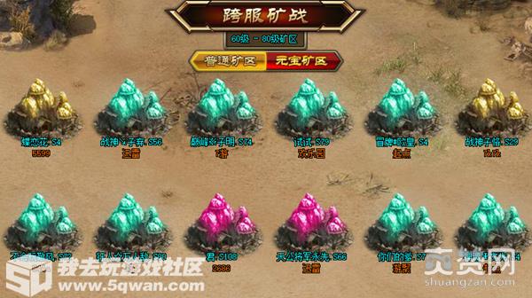 在跨服矿战中,有两个不同的矿区,分别是普通矿区和元宝矿区。在两个矿区中,共有初、中、高、特、超五个等级的宝石矿,其中初级宝石矿为普通矿区所特有,而超级宝石矿则是元宝矿区独有。宝石矿的等级越高,产出的宝石资源越好,占领普通矿区的宝石矿需要消耗一定的体力,而占领元宝矿区的矿坑需要的是元宝,每占领一次消耗50元宝。