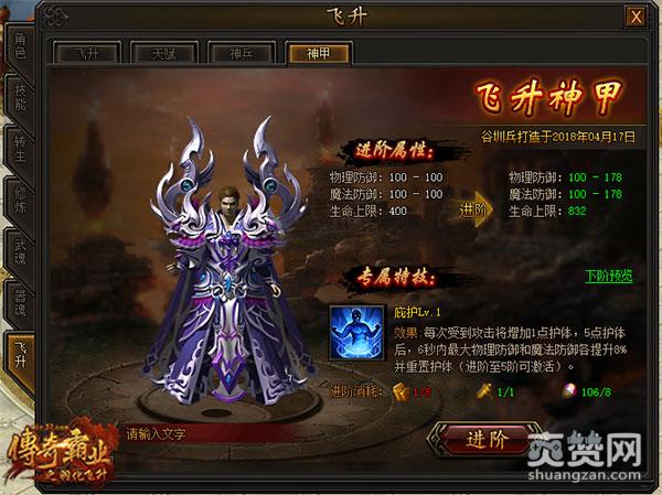 体验转职飞升,亲历羽化成神的奇妙;玩转飞升神殿,与神秘BOSS相约一战……还有不同的神兵和神甲外观显示及专属神兵和神甲特技等待你来激活。