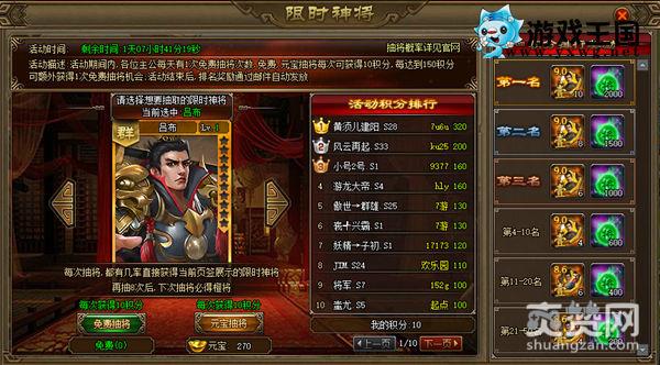 限时神将活动是游戏新推出的抽将活动。在活动期间,主公每天可以免费抽将1次。抽将之后会获得随机一个武将,如果运气好的话,也有可能获得吕布之类的超级神将。除了免费抽将之外,主公还可以使用元宝来抽将。免费抽将和元宝抽将都可以获得一定积分,当积分的数量达到一定的数值时,主公可额外得到1次免费抽将机会