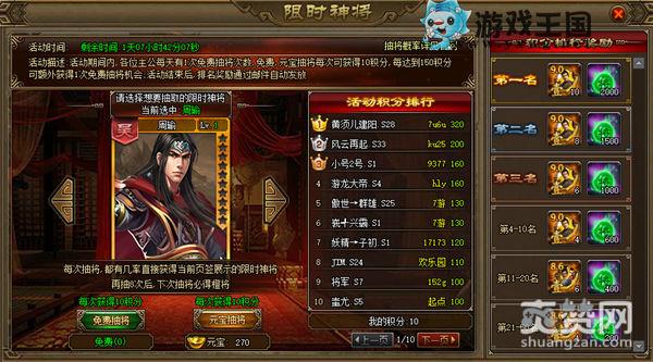 限时神将活动是游戏新推出的抽将活动。在活动期间,主公每天可以免费抽将1次。抽将之后会获得随机一个武将,如果运气好的话,也有可能获得吕布之类的超级神将。除了免费抽将之外,主公还可以使用元宝来抽将。免费抽将和元宝抽将都可以获得一定积分,当积分的数量达到一定的数值时,主公可额外得到1次免费抽将机会。