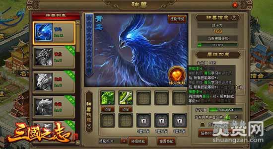 腾讯《三国之志2》神兽系统是一个全新的辅助玩法,玩家通过收集神兽碎片激活神兽,神兽将为所有首发武将及替补武将提供属性加成。神兽按能力分有蓝、紫、橙、红四种品质,品质越高,神兽为武将带来的加成也越高。