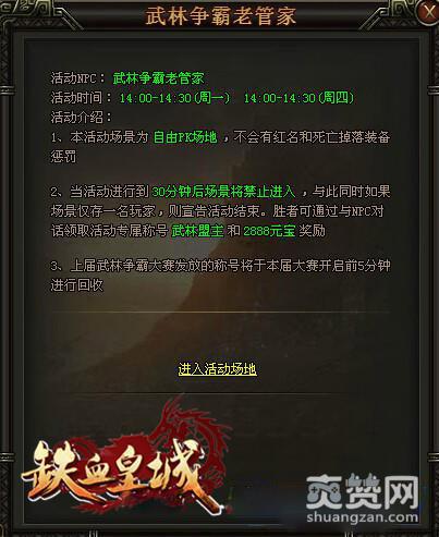 武林盟主之争向来是有固定时间的,萝卜玩《铁血皇城》武林争霸也不例外。每周一、周四14:00-14:30各举行一次,当然你的角色要达到80级或以上才有资格参加哦!从铁血土城NPC武林争霸老管家处可以进入活动地图,活动开启30分钟内可以自由出入,活动场地内自由PK,不会有红名和死亡掉落装备惩罚。所以,兄弟们可以毫无后顾之忧的战斗了。不过,要把握好进入的时间,活动开启30分钟后就不允许再进入场景了,与此同时如果场景内仅存一名玩家,则宣告活动结束,胜者可以通过NPC领取奖励,小编在这里偷偷的告诉你,奖励可是很丰富的哦~