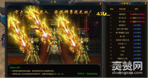另外43u《大明征途》中官职排名也很重要,官职排名实时更新,官职排名前三玩家,威摄效果分别为10%、8%、7%。要是能够冲上前三,想想都觉得很威风吧?