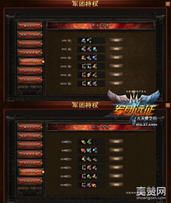 玩家进入37《大天使之剑》时可在界面上方看到军团特权的活动标志,点击进入即可在左侧看到此次活动的各种福利。以前在37《大天使之剑》中充值过的玩家可根据自己的充值金额,在“回归大礼包”中领取相应的奖励,充值越高,奖励越丰富!