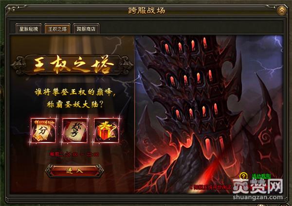 圣妖大陆再启风云,360uu《灭神》又一全新跨服战场玩法来袭,每周二晚21点准时开放,王权之塔共分九层,所有玩家将从第一层开始晋级,并通过击杀其他玩家来获取升层资格,在击杀数目到达规定范围内,即可向上冲锋,在第九层的塔顶,各大服务器的高手都将云聚于此,身后是一条由你杀出的血路,禁止宠物出战,PK无惩罚,还你一个最公平的跨服厮杀,现在开始加入王权之塔,是英雄上九层,在这里证明属于你的荣耀!