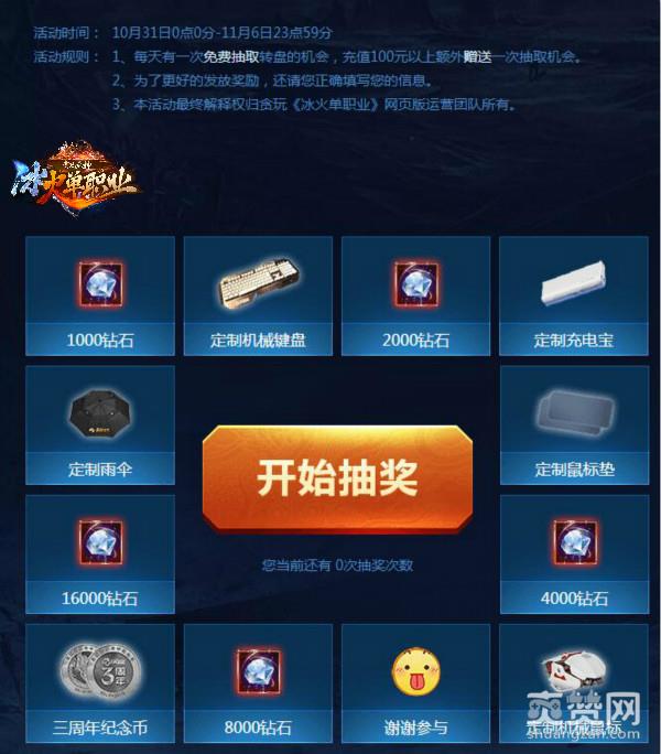 爱玩《冰火单职业》的玩家运气都不会太差,10月31日-11月6日活动期间,每天都有一次转盘的机会,充值100元及以上,即可再次获得抽奖机会哦!机械键盘。充电宝、鼠标垫、雨伞和许多闪亮的钻石都在等你呢!