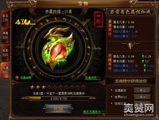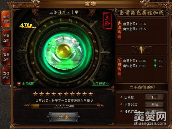 43u《屠龙战神》玩家们通过主线任务将开启宝物系统。宝物内有四个子系统,分为血玉、神盾、官职、龙魂。血玉可增加角色的生命和魔法上限,通过消耗血玉精华可对血玉进行升星,升星后将进一步提高对应的属性增益。通过噬魂系统、世界BOSS以及挂机杀怪都可以获得血玉精华,也可通过参与系统活动或者直接从商城购买血玉精华。