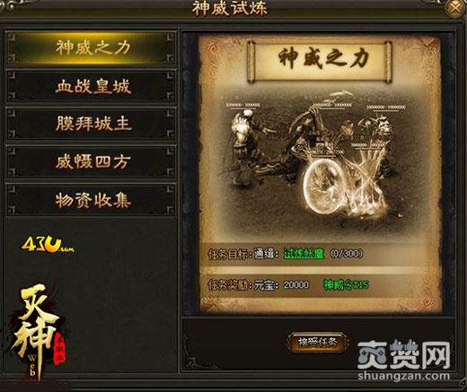 43u《灭神》神威令可以用于获得神威值,提升神威系统。完成五大神威试炼任务,就能获得数量不等的神威令,主要有:神威之力任务可获得15个神威令、血战皇城任务可获得10个神威令、膜拜城主任务可获得10个神威令、威慑四方任务可获得15个神威令、物资收集任务可以获得10个神威令。