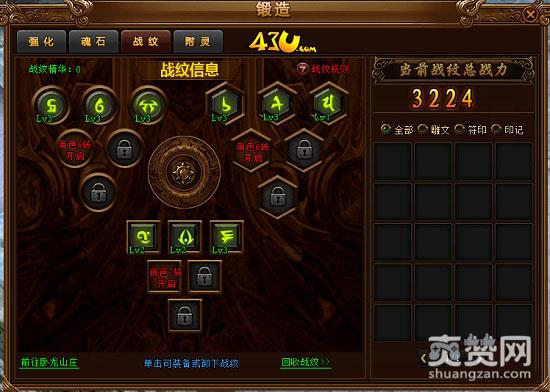 43u《屠龙战神》玩家们角色转生等级达到3转时,可以开启战纹功能。战纹分为雕文、符印、符记3大类,通过将不同的战纹镶嵌到不同的战纹栏位,以提高角色对应的各种属性增益。