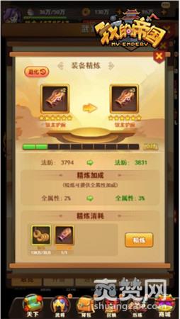 装备除了合成,还能通过强化来提升战力,在《我的帝国》,强化分为强化大师和精炼大师,消耗铜币可以对装备进行强化,但强化等级不能超过主公等级,精炼是指使用铜币和同星级装备对目标装备进行精炼,可将普通装备不断精炼为卓越、完美,并提供装备全属性加成。
