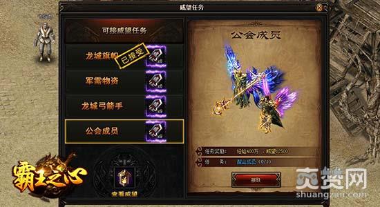 威望可以通过四种途径获得:威望任务、龙城争霸、激情闭关、巅峰王者。其中威望任务可以快速获得大量威望,威望任务有龙城旗帜、军需物资、龙城弓箭手、公会成员四种,每种任务每天可完成一次。