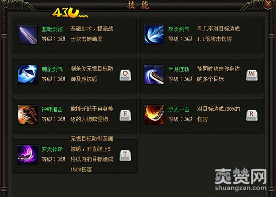 开天神斩:无视目标防御及魔法盾,对直线上5格以内的目标造成150%伤害。