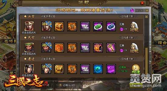 在腾讯《三国之志2》的封地中,有一个名为“巡视”的建筑,玩家进入后可派遣武将进入已拥有的各种领地进行巡视,巡视指令下达后将由武将自动执行,巡视完成后玩家可以获得对应建筑的巡视奖励。