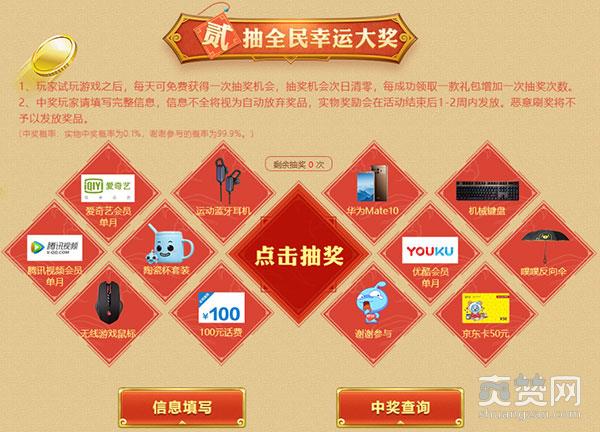 谁会成为下一个37锦鲤?抽一抽奖就见分晓。全民幸运大奖已上线,玩家试玩游戏之后,每天可免费获得一次抽奖机会,华为Mate 10、机械键盘、话费充值……2019年,一起红红火火开个好头。每成功在本页面领取一款礼包,将会增加一次抽奖次数,抽奖机会次日清零。