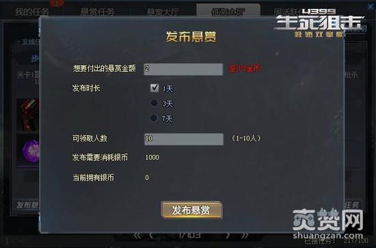 悬赏金额,玩家填写想要发布的赏金金额,货币类型为金币,最低2金币,无上限限制。