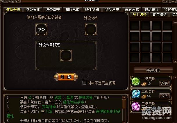 低阶装备的升级都需要一定的灵珠,灵珠分为1-5级,每级的灵珠对应的是不同等级的装备升级所需要的重要材料。这些灵珠主要通过活动和BOSS击杀掉落,当然商城也能出售,不过价格比较高,小编并不推荐。我们在每天击杀BOSS的时候会掉落一定的灵珠,只要我们多攒攒,不要浪费,这些灵珠基本是够用的。