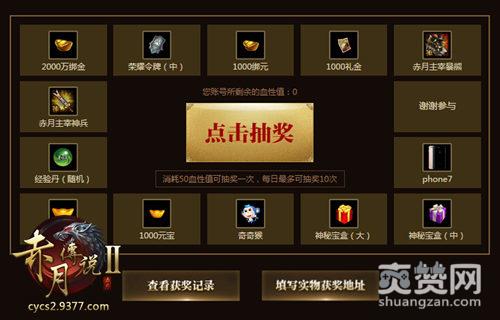 除了兑换元宝奖励外,玩家在9377《赤月传说2》中,还能通过战狼大转盘消耗血性值,而这里是大家获得精美实物奖励的宝地哦。在9377《赤月传说2》战狼大转盘中消耗一定量的血性值即可以参与抽奖,抽奖道具可重复获得,主宰神剑、海量元宝、游戏道具,iphone7等好礼等您来拿,赶快来参与吧!
