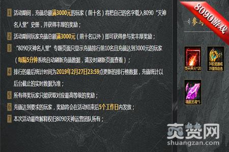 活动规则也是非常简单,除了在游戏中会掉落大量的装备,根据充值排名,玩家也可以获得相应奖励,并且将自己的名字载入“8090名人堂”史册中,这可是名誉的争夺,活动内容可看图下: