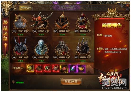 不同服务器的玩家传送到中心服进行跨服BOSS的争夺,BOSS死亡后将会进行BOSS宝藏拍卖,玩家可以一口价买下心仪的道具,或者通过竞价方式获得道具。