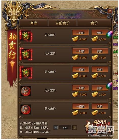 5.道具竞拍成功后,系统会将收益的一定比例,平均分配给在场击杀BOSS输出排行前10的玩家,现场发送,元宝发放到玩家背包里。