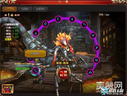 点击游戏王国《英魂三国》界面左下角的“心魔”按钮,可进入心魔系统。在心魔系统中,玩家可对当前的心魔发起挑战,如果挑战胜利则获得封印心魔的资格,如果挑战失败,可以再次挑战直到成功。要彻底打败心魔,需要玩家对心魔进行多层的封印。封印成功后,可挑战下一只心魔。