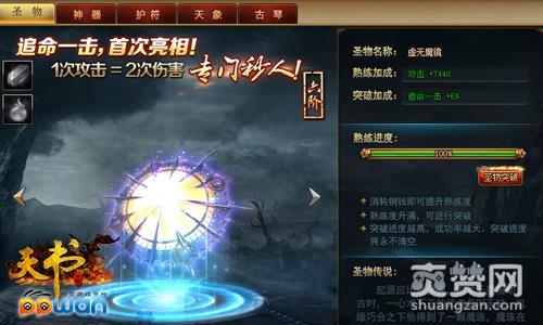 追命一击,专门秒人!ppwan《天书世界》圣物系统作为提升人物战斗力的重要系统之一,包含了圣物、神器、护符、天象和古琴五大玩法,其中圣物1次攻击等于两次伤害,强力暴击你懂得!