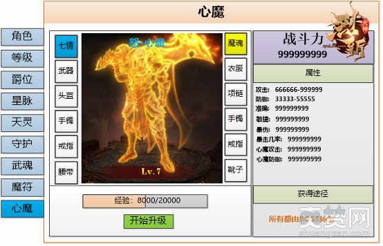 打开心魔系统后,中间是心魔的特效展现。上面的文字为当前心魔的名字;中间则显示当前心魔的等级。经验条是心魔经验,若是满了需要手动升级。