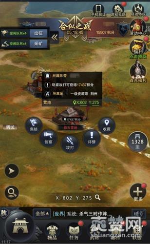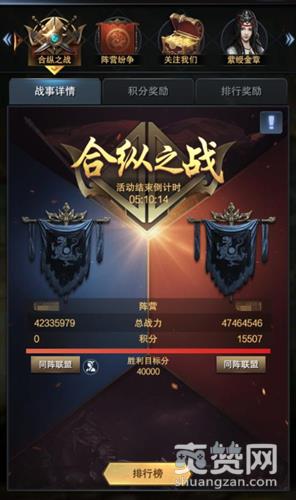 每个主公的营地初始积分将根据当时的战力来评定,攻破其他主公的营地可以夺取悬赏积分,夺取的积分会加到己方阵营的阵营积分上,同时会增加其20%的积分到自身的悬赏积分。活动结束时积分多的一方获胜,如果其中一个阵营获取对方积分达到总积分48%,活动将提前结束。合纵之战作为一个要塞攻防战,援防、进攻都只能在营地中进行。而且,即使是同盟,只要处在敌对阵营,都不能参与集结和援防。