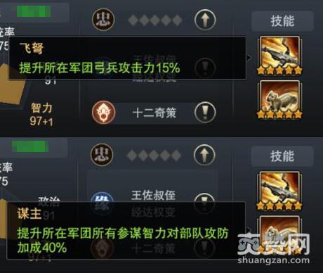 再来看荀攸的技能。他的“飞弩”技能可以提高15%弓兵的攻击力,这一技能的强度和周瑜的“火矢”一样,并且比“无双弓”的效果还要强5%。而荀攸的厉害之处更是在于他的二技能“谋主”,这一技能能提高所在军团智将攻防加成40%。从图中可以看到,在军团带步兵的情况下,因为贾诩和荀攸智力相等,把贾诩换成荀攸,影响军团攻防加成的只有荀攸的“谋主”技能,此时每个部队的攻防都增加了12%左右。这个加成虽然跟军团参谋的智力有关,但也相差不大。这也就可以看做荀攸直接带了一个加强版的“空城”和“无双”技能,可以说是非常强势的一位武将了。