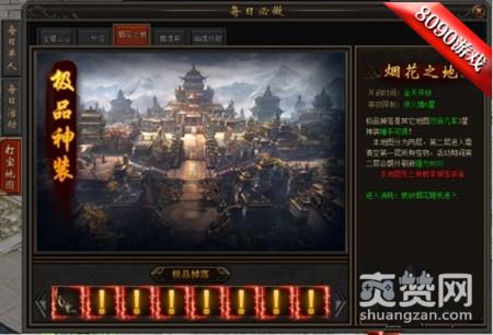 神秘的烟花之地盛产极品神装,极品掉落几率是其它地图的双倍。地图一共分为两层,进入第二层需要清空第一层所有怪物。第二层东、南、西、北由四只神兽镇守,击杀四只神兽之后,地图中间才会刷新超级BOSS,击杀BOSS有几率掉落16阶红色品质武器王者之刃和16阶红色品质乱世套装。