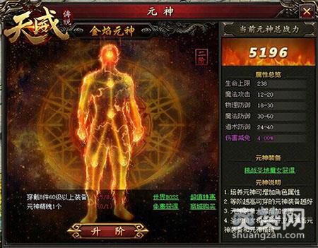 玩家激活元神后,可在元神界面查看目前的元神阶数、元神名称、当前元神总战力、属性总览、元神装备获得处、元神说明等。界面下方会显示玩家升往下阶需要满足的条件。玩家点击界面上的幽冥圣域、世界BOSS活动,或元神装备下方的提示文字,可直接传送至相应场景获得相应装备。玩家满足升阶条件后,点击元神下方升阶按钮,即可进行元神升阶。死亡不掉装备,元神成就战力,萝卜玩《天威传说》正等待天命之子的召唤,新世界的大门等你开启!