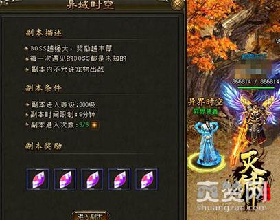 玩家进入到异域时空副本后,每次都会遇见不同的BOSS,而且这个副本内是不允许带宠物出战的。玩家按照副本要求,在限定的5分钟时间内,击杀副本内的BOSS,即可通关副本并获得一些奖励强化石、经验值奖励。玩家在挑战BOSS时,可使用元宝或钻石进行鼓舞,提高自身的战斗属性。