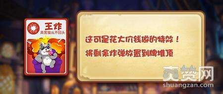 要讲解的第二张牌是“王炸”,这张卡牌标题、原画和效果都非常“炫酷”的卡牌,可以将当前剩余的所有“炸弹”放置到牌库顶端。是不是咋一看觉得没什么用呢?其实用处也多着呢!首先这样一来你就可以知道除了顶部的几张卡牌外,其余位置是绝对没有“炸弹”的,此时你就可以放心地使用“抽底”。