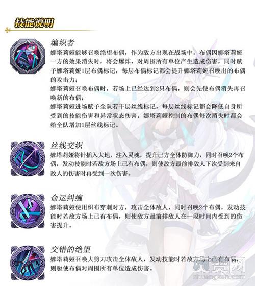 作为输出型英雄,娜塔莉娅被动技能“编织者”能召唤绝望布偶加入战斗。而主动一技能“丝线交织”,则是娜塔莉娅将针插入大地注入灵魂,提升己方全体防御力,同时召唤布偶。使出主动二技能“命运纠缠”时,娜塔莉娅使用织布穿刺对方攻击敌人,亦将会召唤布偶加入战斗。主动三技能“交错的绝望”则是娜塔莉娅召唤大剪刀攻击全体敌人。