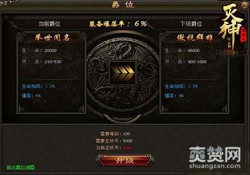 萝卜玩《灭神》中爵位可以带来大量的生命和攻击加成,当然最重要的还是加装备爆率。爵位的升级可以给玩家带来新的爵位地图。有的玩家会说这个爵位升级感觉爆率升的不明显。自己感觉不到,这个您可以自己比对下boss死亡后物品掉落后可以回收的元宝数量,这个会有一个直观的比较。