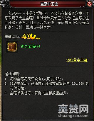 43u《血饮传说》神之宝藏活动时间是每天的20:00-21:00,等级达到50级的玩家都可以参加,在活动中会有三种宝藏,分别是金、银、铜三个级别。每种宝藏只能被一个玩家领取,领取宝藏的玩家将宝藏运送给宝藏管理者后,就可以获得大量的奖励。如果宝藏持有者在中途被击杀,那么击杀者将获得宝藏继续运送。