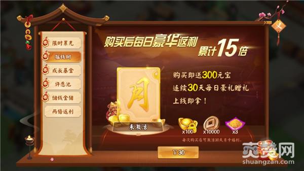 新服专属摇钱树活动精彩上线。购买即送300元宝,连续30天每日豪礼赠送,上线即拿。购买摇钱树,每日豪华返利累计15倍,让你的元宝能增值。多送的元宝怎么办?别急着花,赶快投资成长基金,488元宝变1600元宝。人在家中坐,元宝滚滚来,躺着赚钱就是这么简单。