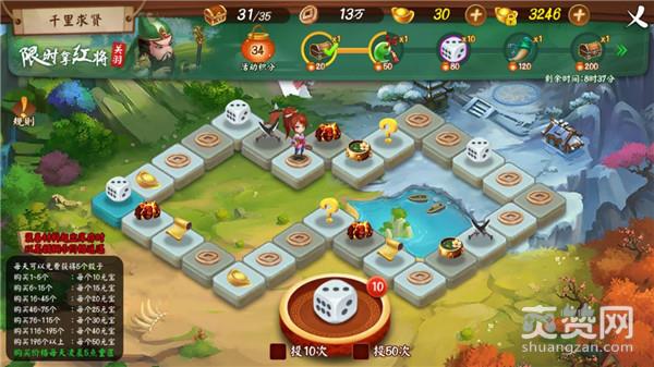 新服开启4天后,千里求贤活动随即上线。每天玩家可免费获得5粒骰子,通过摇色子行动,达到相应目标点即可获得材料、元宝、铜钱等。玩家还可通过元宝购买骰子,随着购买骰子的次数增多,价格也会上涨,购买价格会在每天凌晨五点重置。当玩家走到一定步数后就有机会获得超稀有红将——关羽!